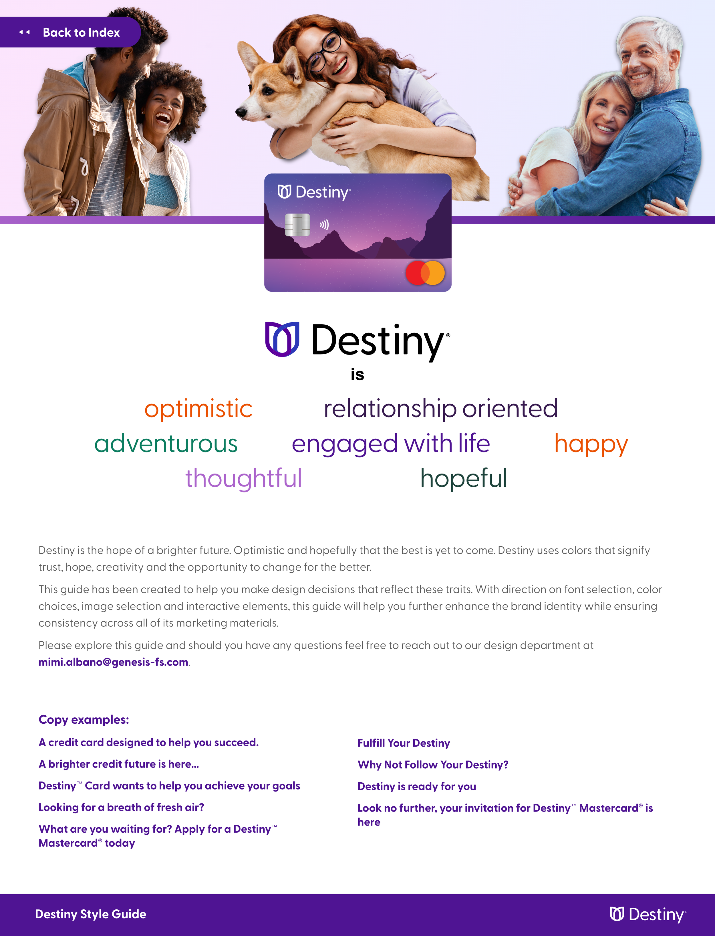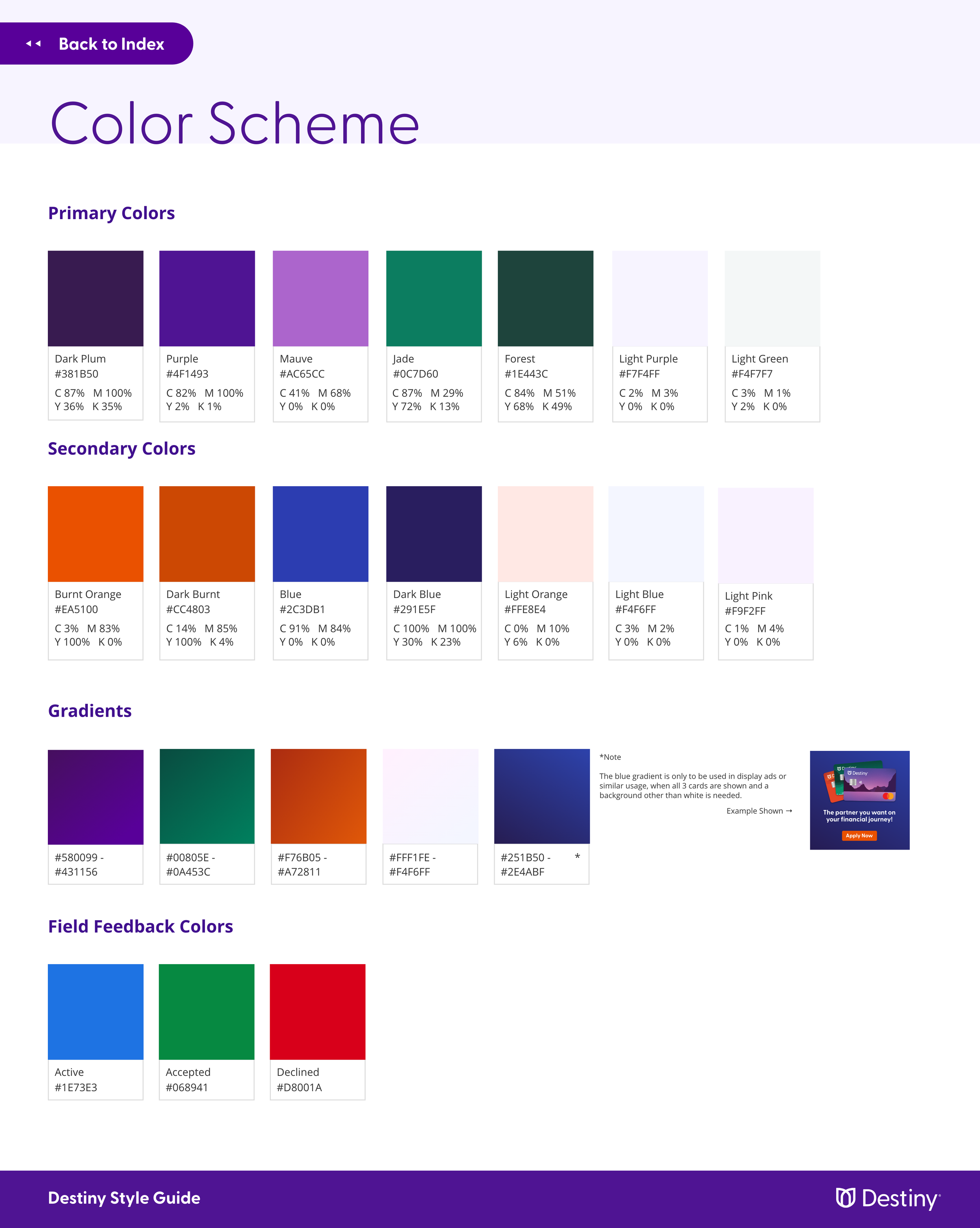 Destiny Mastercard provides credit to individuals seeking a helpful and optimistic financial future. The challenge involved rebranding the existing brand's presence through new logos, 3 new credit cards, fresh fonts and colors, and a robust style guide. My approach was to design cards that resemble physical places — a desert, a marsh at dusk, and a mountainous lakeside at dawn. I developed the color palette off of these three environments and wanted them to have high contrast with one another to offer ease of use when designing across various deliverables.