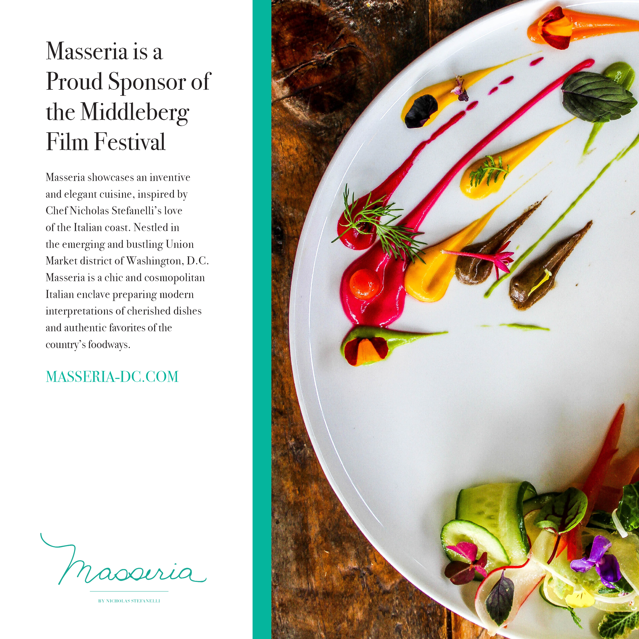 I led art direction for a print ad featured in the Middleburg Film Festival program. Collaborating closely with Chef Nicholas Stefanelli, I photographed and styled visuals that captured Masseria’s refined yet vibrant Italian dining experience, translating the restaurant’s ambiance into elevated, editorial-style photography.